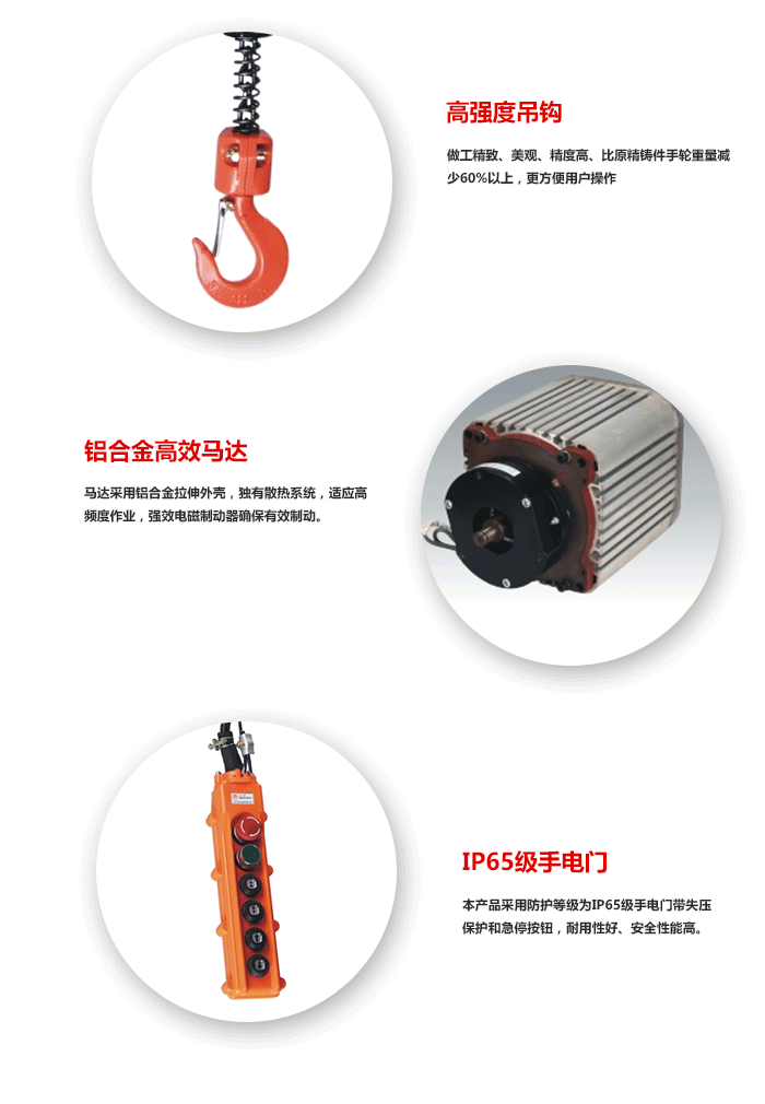 本机主要零部件均采用高级合金钢材料,并经多道特殊热处理工艺加工,具有强度高、耐磨性好等特点;上、下吊钩采用高强度合金钢制作,经强化热处理后具有很高的韧性,即使机体因超载引起破坏,吊钩也只会产生朔性变形而不会发生脆性断裂。