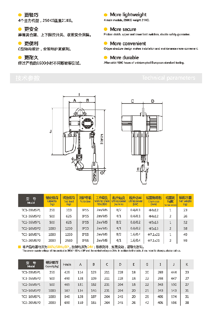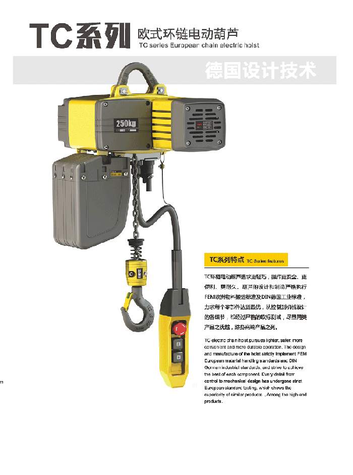 双速起升速度为标准配置,备有吊钩式与吊耳式两款悬挂方式,也可直接与电动小车吊销连接,使其连接更为完美。